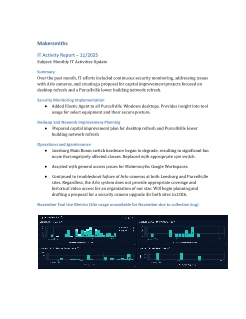 No Finance Committee meeting. Nick Leshock and the Treasurer presented the 2026 proposed budget with options at the November Board meeting. The Board held a working meeting to review the proposed 2026 budget with 3 Board directors present. The suggested changes included: increase President's Discretionary Fund to $100 per month, increase the Emergency Fund to $2000 per year, add funds to Stained Glass maintenance budget, Welding steward would provide a revised Welding consumable and maintenance budgets as there appears to be duplicate items, remove funds from tax attorney account, Steward of UV printer, sublimation and BN2-20 would move maintenance items from consumables to maintenance budgets. The Treasurer revised the 2026 proposed budget per these comments and included the options: outsourcing QuickBooks to a professional accounting service, removing some of the equipment/consumable fees, adding $100 per shop for minor tools/improvements.